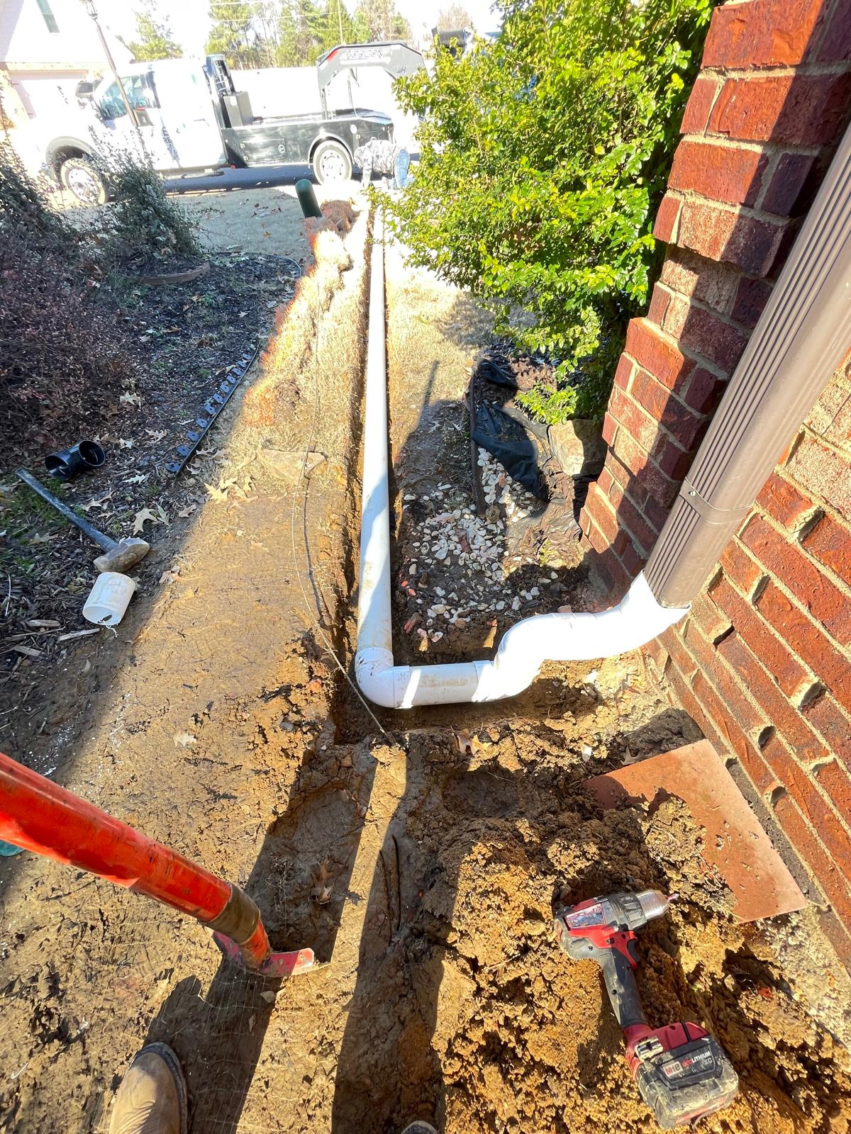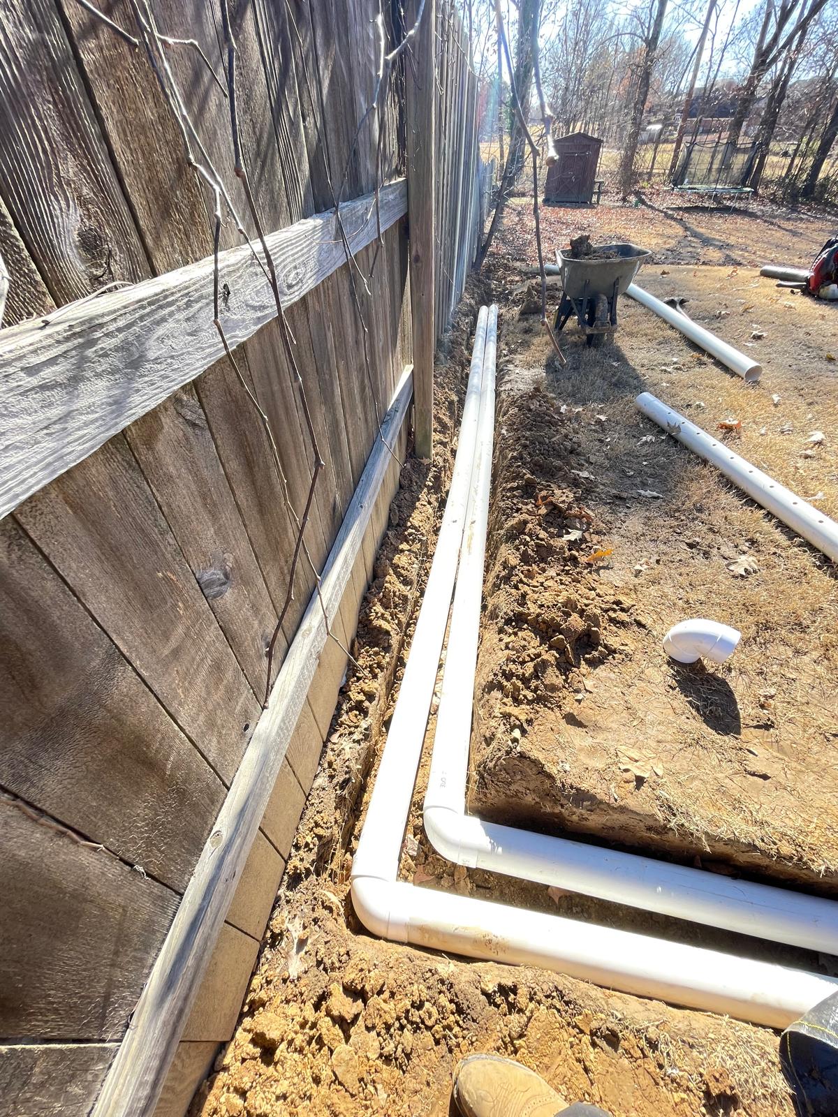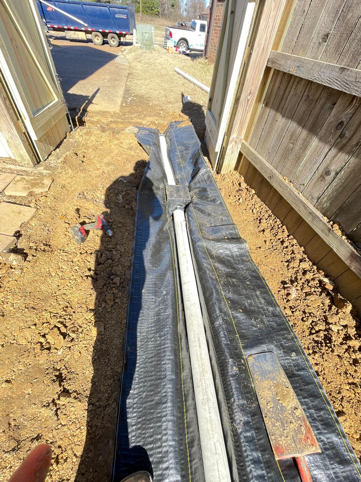 We also attached the existing gutter downspouts and tied them into the new drainage run. By connecting the downspouts directly into the corrugated pipe, roof runoff is guided into the drainage system instead of dumping near the foundation or low areas. This helps reduce concentrated water near the home and directs it toward a safer exit point.