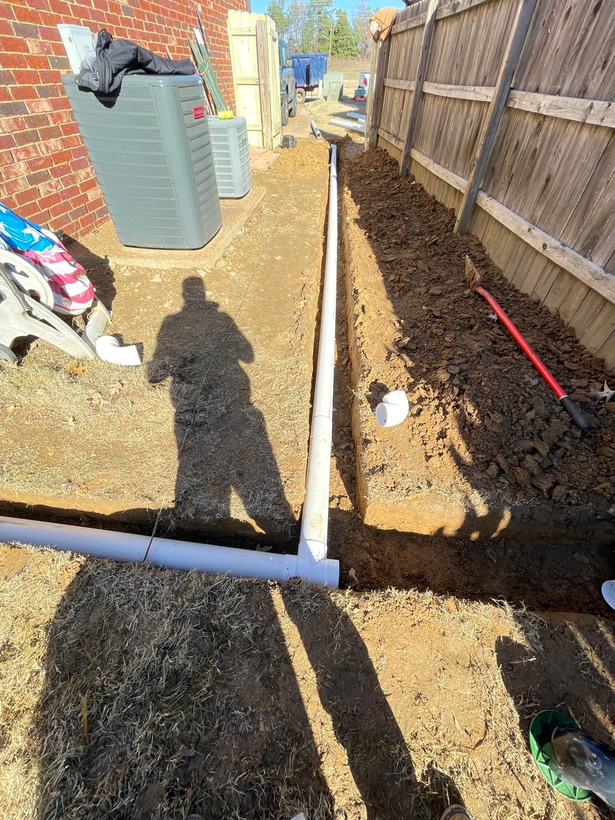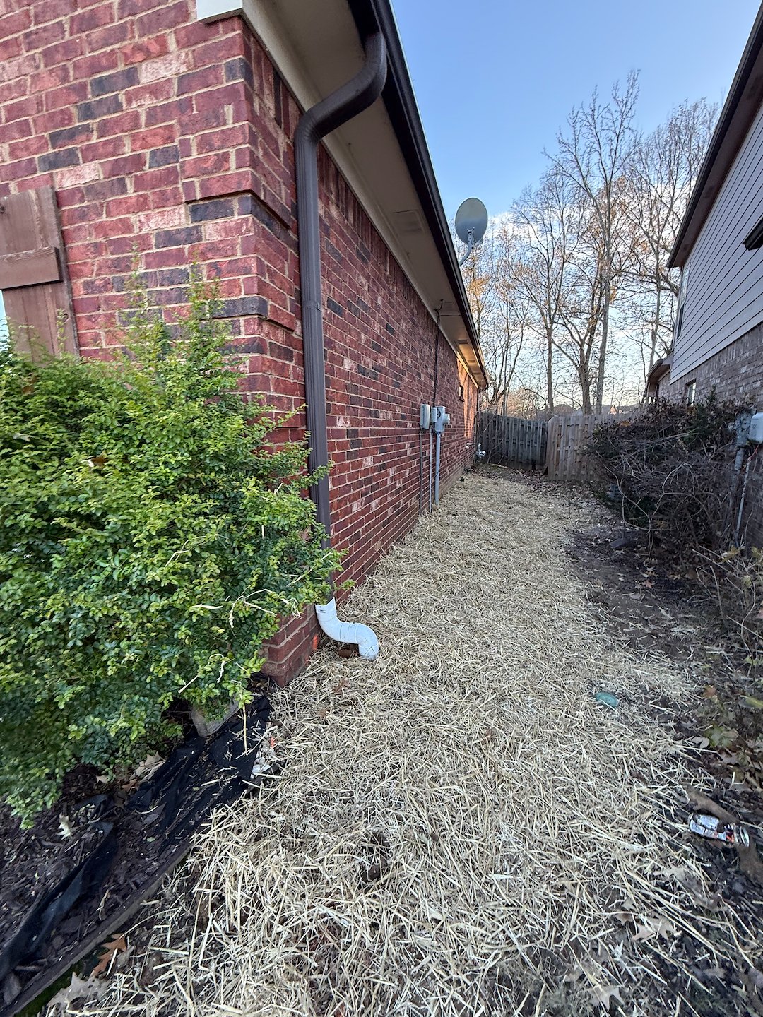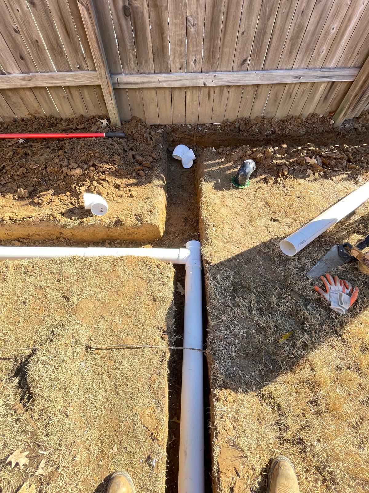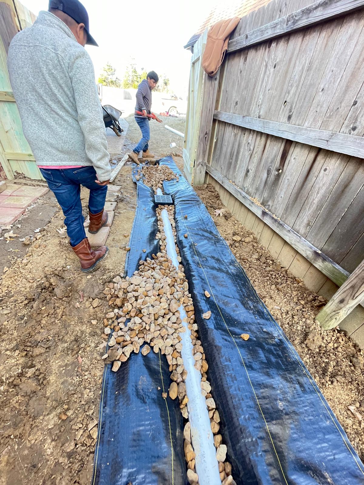 We also attached the existing gutter downspouts and tied them into the new drainage run. By connecting the downspouts directly into the corrugated pipe, roof runoff is guided into the drainage system instead of dumping near the foundation or low areas. This helps reduce concentrated water near the home and directs it toward a safer exit point.