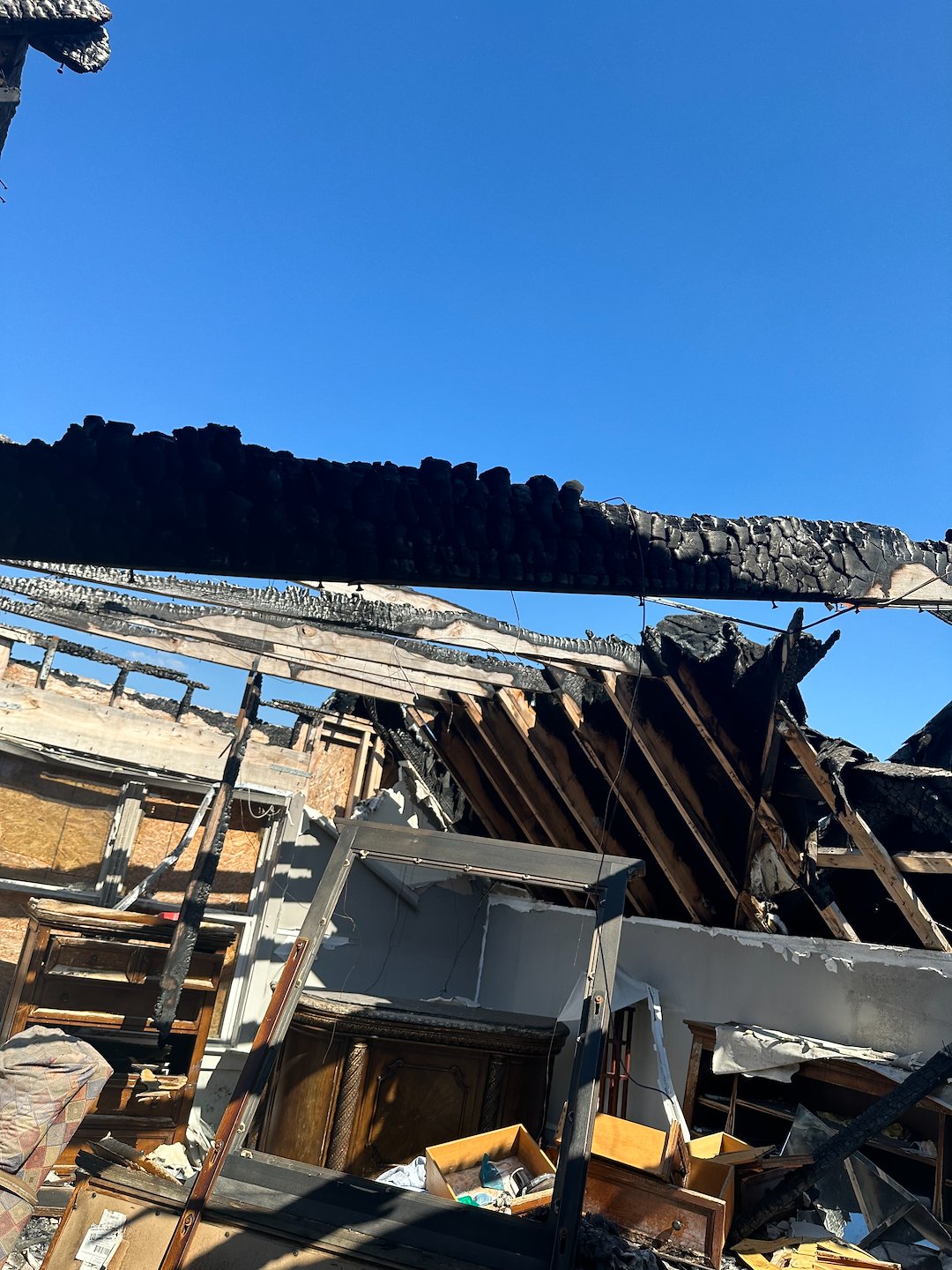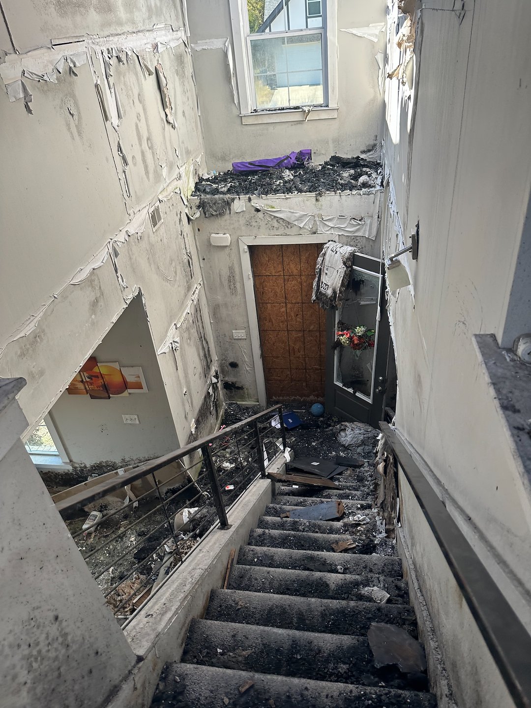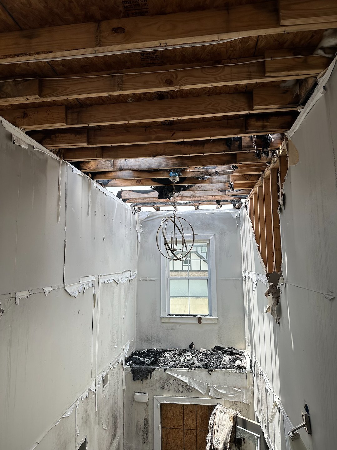 The first step was a total gut of the interior, removing damaged finishes, fixtures, and contaminated materials. Because the water had caused severe deterioration, the second story needed to be reframed from the studs up. We also installed new structural beams where water damage had caused a sag, restoring proper support for the floors and roof framing.